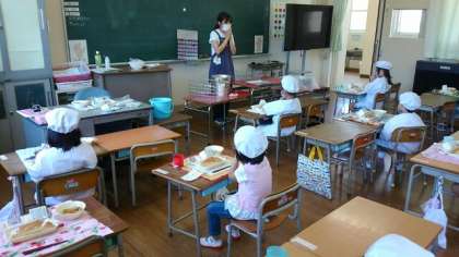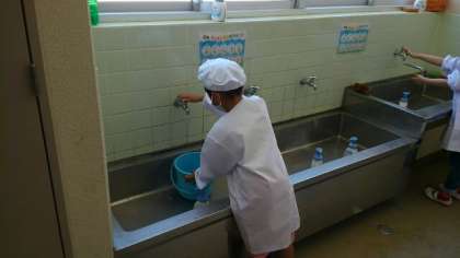 1年生は小学校の給食を食べるようになって1週間が経ちました。配膳台を拭くのは、1年生のお仕事です。当番が毎回バケツに水を入れて台を拭きます。本当は友だちと机をつけて楽しく話しながら食べたいのですが、今は前を向いて黙って食べています。