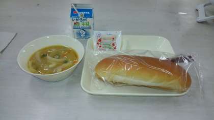 「パン・牛乳・副食一品」の組み合わせは今週までです。来週から週3回程度ごはんが出ます。副食が2〜3品、日によってはデザートがつきます。楽しみにしてください。