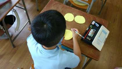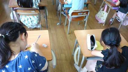 2年2組では、誕生日を迎えるお友だちにメッセージを書いていました。今月誕生日の児童は3人いました。3人それぞれへの優しい言葉を書き込んでいました。書き込んだ紙にひもを通してメダルにして贈ります。お友だちのことを思いやれるように育ってほしいと思います。