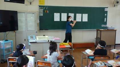 2年生では、音楽科で「ともだちとせかいのあそびを楽しみましょう」をテーマとして、「B・I・N・G・O(ビンゴ)」の歌を歌いました。ビンゴといったら真っ先に思い出すのはビンゴゲームですが、今回は犬のお名前のようです。黒板にアルファベット5文字を貼って、下に下がっている文字を歌う時だけ、声を出さず手拍子をします。1文字・2文字下げられ、さらにスピードが速くなると、難しくなります。でも、5文字すべて下がると簡単になるので思わず笑いが出ました。