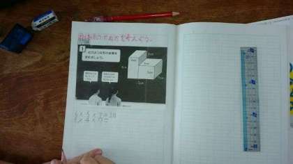 体積 公開日 2020/06/30 更新日 2020/06/30 お知らせ 5年生は算数科で複雑な立体の体積を求めました。子どもたちは、立方体や直方体の体積は求められるようになっています。その方法を活かして、複雑な立体の体積を求めるため、見取り図に補助線を入れて考えます。いろいろ考えられたようですが、その考えを正確に式に表し、計算できたでしょうか。 いいね(0)