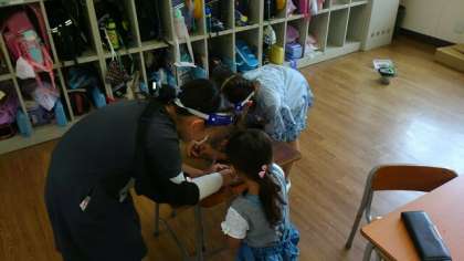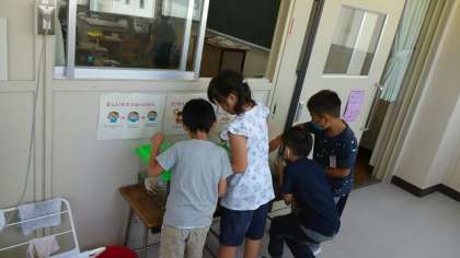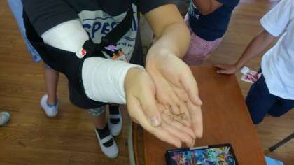 生きものなかよし大さくせんの成果 公開日 2020/07/01 更新日 2020/07/01 お知らせ 休み時間に2年生に声をかけられ、教室へ行ってみました。ザリガニのお世話をしていたり、虫かごからバッタを出して手の上に乗せたりしていました。バッタには全く逃げる様子がありませんでした。バッタを手なずけていて、生活科で学習している「生きものなかよし大さくせん」がうまくいっていることがわかりました。 いいね(0)