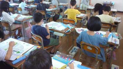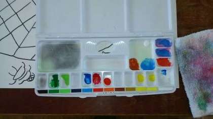 3年1組では、不思議な魚に絵の具で色を塗っていました。パレットや水入れの部屋にはそれぞれ役割があることを、前回習っています。気をつけている児童のパレットや水入れは、描いている絵と同じように、とてもきれいです。