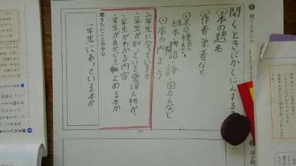4年生は国語科で「たしかめながら話を聞こう」を学習しています。低学年のお話会で紹介したい本を選ぶため、どんな本がよいかクラスで聞きます。聞く時に確認することを班で話し合い整理しました。友だちの意見でよいと思ったら、自分のワークシートに書き足していました。