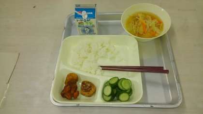 7月6日(月)の給食は、ごはん・牛乳・豚肉の香味あげ・すまし汁・あっさりきゅうりです。豚肉の香味揚げは、なたね油でからりと揚げています。衣の香ばしさと中の豚肉の軟らかさがよい食感となっています。