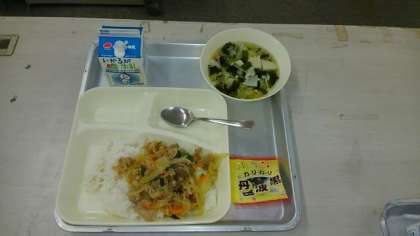7月20日(月)の給食は、豚丼・牛乳・すまし汁・いり黒豆です。ごはんの上に、つゆがたっぷりのった豚丼は、甘辛いたれが効いていてとても美味しいです。