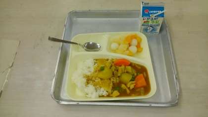 7月21日(火)の給食は、チキンカレーライス・牛乳・フルーツ白玉です。鶏肉がゴロゴロ入ってとても食べ応えがあります。じゃがいもやニンジンもたくさん入っています。カレーはマイルドな味わいで、子どもからも大人からも好まれる味付けです。