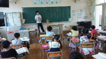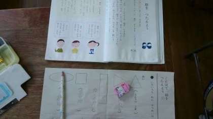 2年2組では、国語科で「ことばで絵を伝えよう」を学習していました。三角形や四角形などで表された絵を言葉だけで表します。まずは、導入として、横向きの三角形や3つ横につながった円などを自分の言葉で表していました。今後、絵が複雑になってくると、単に言葉で表すだけでなく、表す順番も大切になってきます。
