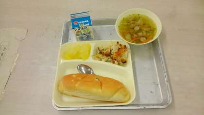 7月28日(火)の給食は、おさつパン・牛乳・マカロニグラタン・スープ・りんごです。グラタンという名前は、焼き色を付けたり、こげたところをこそげとったりする意味のフランス語から名づけられました。マカロニグラタンは、粉末チーズをふって、290度で立ち上げた焼き物機で10分間こんがり焼いています。
