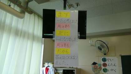 横には話し合いのルールが掲示されていました。「まず」「次に」「だから」の間に「周りをみる」が強調されていました。自分が発言するとき、常に聞き手の立場に立つことが大切であることに気づいてほしいです。