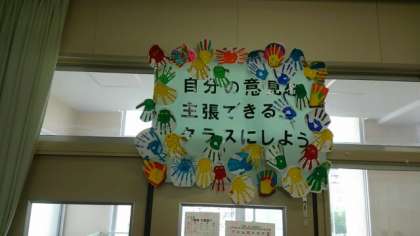 横には、「自分の意見を主張できるクラスにしよう」と学級目標が掲示されています。目標に向かって頑張っています。