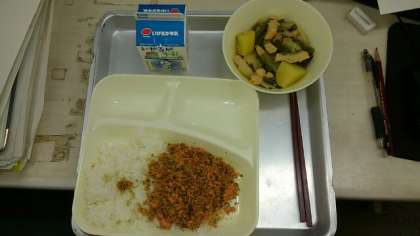8月6日(木)の給食 公開日 2020/08/06 更新日 2020/08/06 お知らせ 8月6日(木)の給食は、ごはん・牛乳・鶏肉とじゃがいもの煮もの・紅ざけそぼろです。そぼろは、ひき肉や魚、卵などをパラパラにいったものです。今回は紅ざけを使いました。いりごまを加えて丁寧に炒っているので、ふわっとしてパラパラなふりかけになっています。ごはんがより美味しく食べられます。 いいね(0)