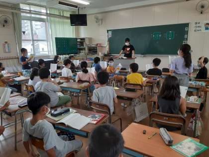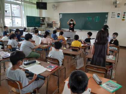 3年1組では、国語科で「紙ひこうき」のたけのこ読みをしていました。児童が1行ずつ順番に音読します。順番は決めず、自分だと思ったときに立ち上がって読みます。当然複数が同時に読むことがありますが、途切れてはいけません。「心を一つに」「空気を読んで」を合言葉に、最後まで読み終えることができました。