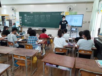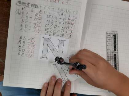 6年生では算数科で「点対称」を学習しています。180度回転させたり、中心を通るようにして対応する点や辺や角を結んだりして、点対称の図形について調べていました。