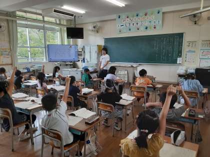 2年2組では国語科「うれしくなる ことばを あつめよう」を学習しています。前時に、話がうまくつながるために大切なことを考えました。本時では、実際にどのような言葉がけや言葉の返しが良いのか、教科書を読みながら考えていきました。自分は相手と思いが似ているのか違うのかを伝えることが大切なことに気がついたようです。