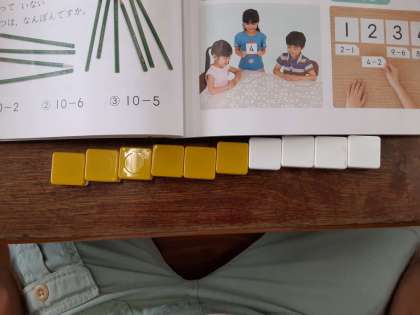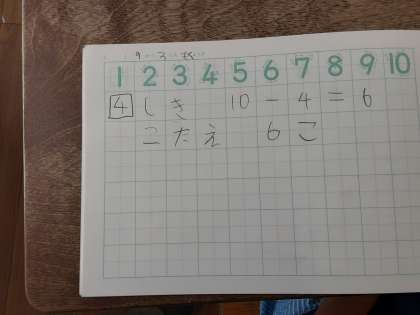 ひき算 公開日 2020/09/03 更新日 2020/09/03 お知らせ 1年生は、ひき算の文章問題を読み取って、式や答えを考える学習を進めています。前時まで「のこりはいくつですか?」「ちがいはいくつですか?」の問題について考えました。本時は「かきごおりが10こあります。いちごは4こあります。メロンはいくつありますか?」の問題でした。タイルをかき氷に見立てて、式や答えを考えました。 いいね(0)