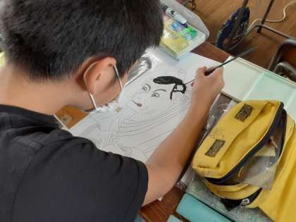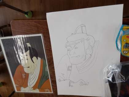 5年生では、エプロン作りと並行して、図画工作科で浮世絵の模写をしていました。本物そっくりなので、できあがりが楽しみです。