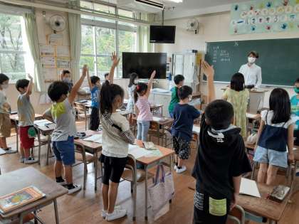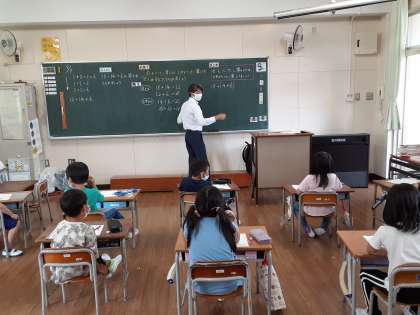 2年生では、学力向上推進事業で本校に関わっていただいている指導教諭の盛田恭平先生に算数科の授業をしていただきました。「18+14+6」を計算する順番について話し合いました。「18+14」を先に計算する児童と「14+76」を先に計算する児童に分かれました。計算する順番によって答えが違うという意見がほとんどでした。