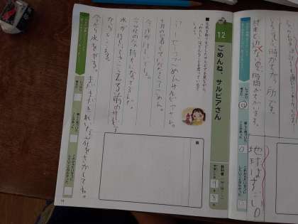 ごめんね、サルビアさん 公開日 2020/09/08 更新日 2020/09/08 お知らせ 3年1組では道徳科で「ごめんね、サルビアさん」を学習していました。最初はサルビアの世話をきっちりするつもりだったけれど、慣れてくるにつれて「今日は別にいいかな」という気もちになってしまうことがあるかもしれません。世話を怠ったために枯れかけているサルビアへ話しかける言葉を考えていました。まるで困っているお友だちに話しかけるような優しい言葉がいくつも出ていました。 いいね(0)