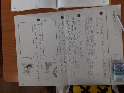 おおきな かぶ 公開日 2020/09/08 更新日 2020/09/08 お知らせ 1年生では国語科で「おおきな かぶ」を学習しています。「おじいさんは、なんと いって、かぶの たねを まきましたか。」「どんな かぶが できましたか。」物語を読むとそのまま書かれていることなのですが、一人ひとり読み取れたことを確認するために、文章のその箇所に線を引くようにしています。 いいね(0)