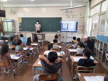 1年生は国語科で漢字の学習が始まっています。これまで、「一」「二」と習いました。本時では「三」を習います。マスの中にバランスよく書く練習をした後、「三」が使われている言葉を集めました。たくさん手が挙がりたくさんのことばが発表たくさんの言葉がされました。中には「三」の漢字ではない言葉も出ましたが、言葉によって漢字が使い分けられることは、これから学んでいきます。まずは、漢字を書くことに苦手感をもたないようにしていきたいです。