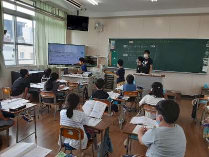 数直線 公開日 2020/09/10 更新日 2020/09/10 お知らせ 3年生では、算数科で「10000より大きい数を調べよう」を学習しています。本時では、数直線の上にある数字を読んだり、ある数を数直線上に表したりする学習をしました。大型テレビ画面を使って指示棒で一所懸命に説明する姿が見られました。 いいね(0)