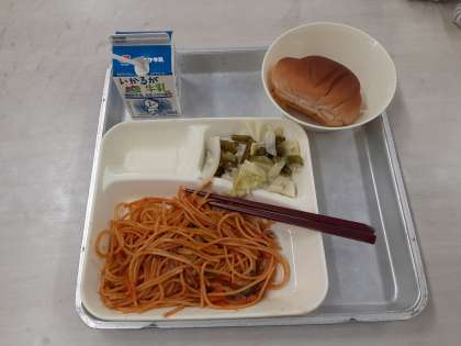 9月11日(金)の給食は、黒糖パン(1/2)・牛乳・イタリアンスパゲッティ・グリーンアスパラガスとキャベツのサラダです。ウインナーやたまねぎなどの具材が入って、ケチャップがたっぷりと絡まったスパゲッティを「イタリアンスパゲッティ」といいます。全国的には、「ナポリタン」と呼ぶ地域が多いようです。今回の給食では、豚肉やピーマン、マッシュルームも加わってとても美味しいです。