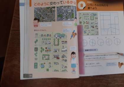 4年生では、算数科で「いろいろな四角形について調べよう」の学習が始まりました。本時では、導入として、絵地図の道を線で結んで、その線の交わり方について調べました。まず、丁寧な作図ができるように心がけてほしいです。