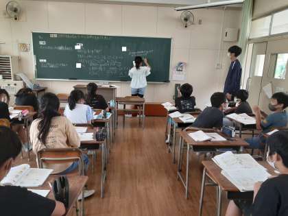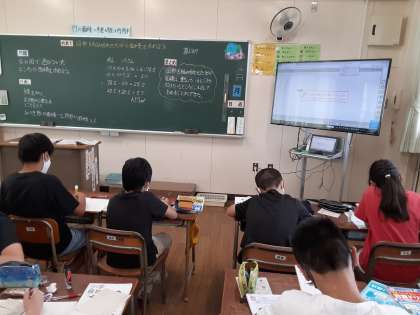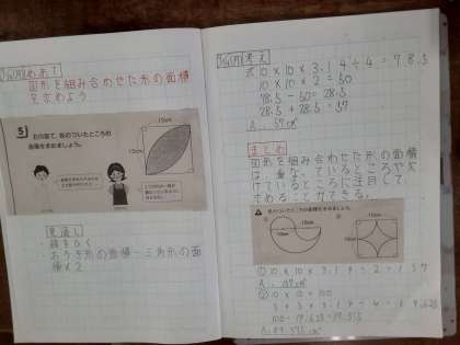 6年生は算数科で、円などの図形を組み合わせた形の面積を求めました。円を1/4にわけたおうぎ形や、円を1/2に分けた半円を、つないだり重ねたりして組み合わせた部分の面積を求めます。円の面積を求める公式を利用し、3.14を使った計算に苦労しながらも、ノートや黒板には、子どもたちの考えが次々と書かれていきました。