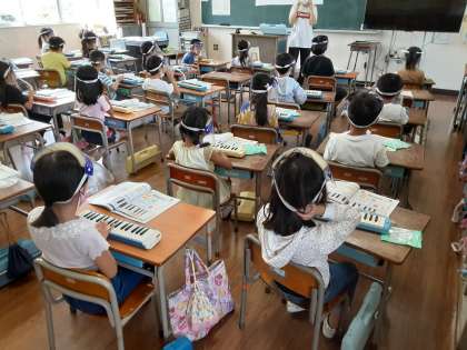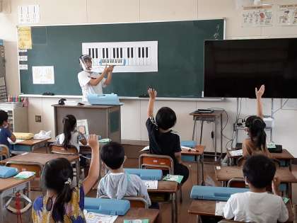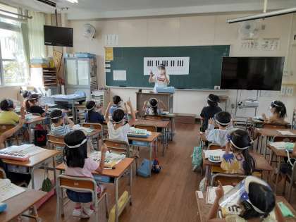 1年生は音楽科で「けんばんハーモニカで いくつかの おとを みつけましょう」の学習をしています。高い音と低い音、強い音と弱い音、長い音と短い音など、指の使い方や息の吹き方で変えることができます。指の体操をした後、自分たちで確かめてみました。鍵盤ハーモニカの演奏、楽しさに気づいたでしょうか。