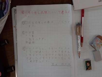 20の10倍 公開日 2020/09/15 更新日 2020/09/15 お知らせ 3年生は算数科で、20を10倍するといくつになるのかを考えました。20のたし算を積み重ねる方法、20×9の答えを利用する方法などが出てきました。 いいね(0)