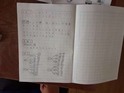 6年生は、算数科で「ならび方や組み合わせ方を調べよう」を学習します。2人での並び方は〇通り、3人での並び方は〇通りというように、人数が増えれば当然並び方は増えます。本時では、図に表して考えていました。
