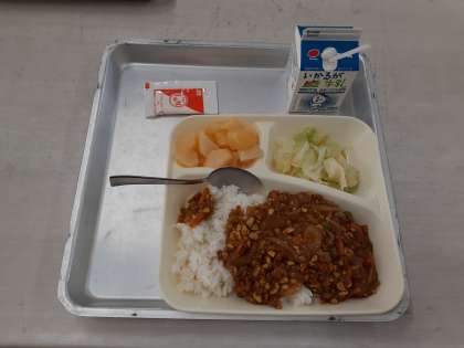9月23日(水)の給食は、大豆入りキーマカレーライス(米粉)・牛乳・キャベツとコーンのサラダ(ノンエッグドレッシング)・白桃(カット缶)です。「キーマ」とはインドの言葉で、「細かいもの」という意味で、「キーマカレー」とは、ひき肉(細かく挽いた肉)を使ったカレーのことです。今回は、ひき肉のほかに、ひきわり大豆も使っています。
