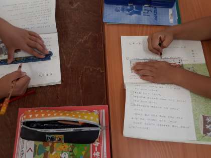2年生では国語科で「ニャーゴ」を学習してきました。1組では、班ごとに役割を分担して音読の練習をしていました。ねこと子ねずみに分かれて読むようです。自分がどの部分を読むのかわかりやすくするために、文に線を引いていました。