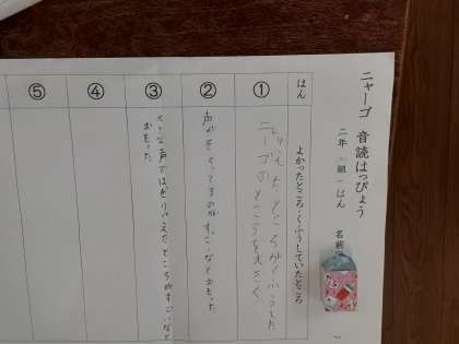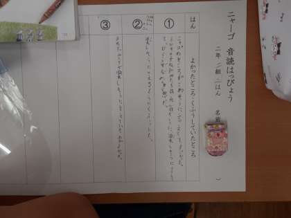 音読発表 公開日 2020/09/23 更新日 2020/09/23 お知らせ 2年2組では国語科「ニャーゴ」の音読発表をしていました。発表の後に、よかったところや工夫していたところをワークシートに書き留めていました。自分の班のところには、自分たちが頑張ったところや工夫したところを書いています。友だちのよいところを見つけられたようです。 いいね(0)