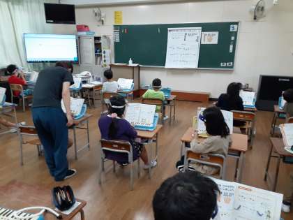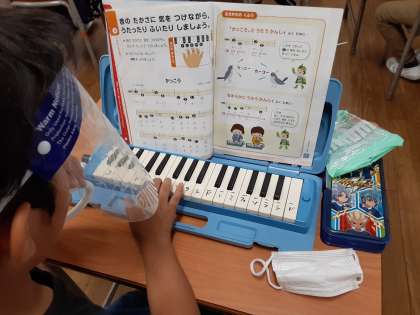 2年1組では、音楽科で「かっこう」の練習をしていました。「ソ・ミ ソ・ミ」のフレーズをかっこうが鳴くように演奏します。舌を使って、音を短く切りながら吹きます。一方で、「レ・レ・ミ・ファ・レ」の部分は滑らかに演奏します。舌や息の使い方が難しい曲ですが、がんばって練習していました。