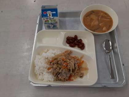 9月28日(月)の給食は、他人丼(個別対応献立:卵)・牛乳・とうがんのみそ汁・金時豆の煮ものです。金時豆はいんげん豆の仲間で、赤紫色が鮮やかなことから「赤いんげん」とも呼ばれています。炭水化物やたんぱく質・お腹の調子を整える食物繊維などをたくさん含んでいます。その他にも貧血を防ぐ鉄なども含まれています。