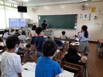 3年生では社会科で、スーパーマーケットや商店街について調べます。自分たちの家の方が、どのお店で買い物をするのか調べると、スーパーマーケットがいちばん多かったようです。商店街、コンビニ、近くのお店と続き、少数ですがインターネットでの買い物もあるようでした。まず、身近な粉浜商店街について調べることになり、商店街にはどんなお店があるのかを出し合いました。