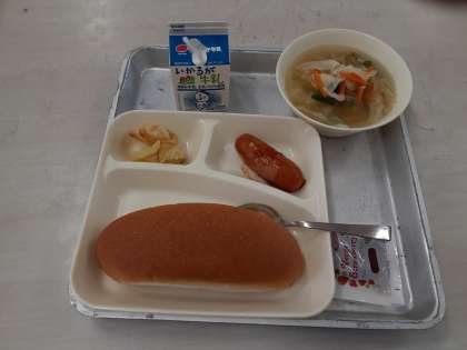 9月29日(火)の給食は、コッペパン・いちごジャム・牛乳・フランクフルトのケチャップソース・スープ・焼きじゃがです。牛などの腸の皮や人工的に腸の皮に似せて作られたものを「ケーシング」といいます。フランクフルトは、豚肉や牛肉などのひき肉と、香辛料、調味料などを加え、混ぜ合わせたものを「ケーシング」につめて、煙でいぶして作ります。給食では、ゆでて、デミグラスソースやウスターソースを合わせた特製ケチャップソースをかけて味つけします。