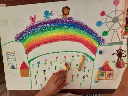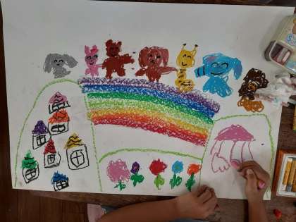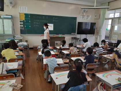 にじの はし 公開日 2020/09/29 更新日 2020/09/29 お知らせ 1年生では図画工作科で「にじの はし」を描いていました。まずパスの長い横の部分を利用でいて7色の虹を描きます。そして、遊園地やお花・動物など、「にじのはしのなかまたち」を描き入れます。楽しそうに橋を渡る動物やきれいな花が描かれました。 次時には、絵の具で雲などが書き加えられるようです。きっと夢のようなすてきな絵になることでしょう。 いいね(0)