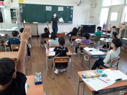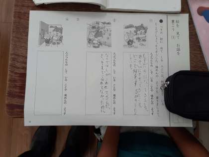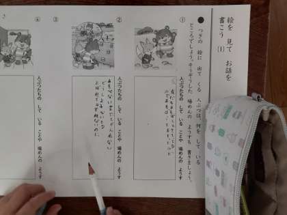 2年生では国語科で「絵を 見て お話を 書こう」を学習しています。絵から想像を広げてお話を書きます。人物がすることや場面の様子を見てワークシートに書きますが、各場面のお話がつながるように書かなくてはいけません。まず1場面と2場面のお話を書きました。お話をうまくつなぐことができたでしょうか。
