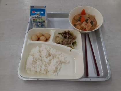 9月30日(水)の給食は、ごはん・牛乳・一口がんもとさといものみそ煮・牛肉と野菜のいためもの・みたらしだんごです。本日は月見の行事献立です。今日10月1日は、旧暦(昔の暦)の8月15日にあたり、「十五夜」や「中秋の名月」といいます。月が美しく見えるときで、いもやだんごを供えたり、すすきを飾ったりしてお月見をします。
