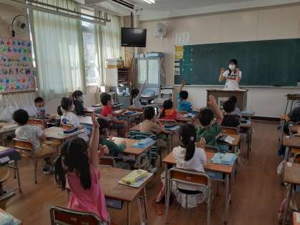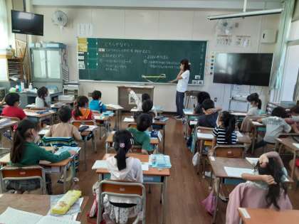 1年生では算数科で「どちらが ながい」の学習をしています。先生が鉛筆を取り出し、長さを比べる方法について尋ねました。次に、リボンの長さを比べる方法を尋ねました。子どもたちは意見を出し合って、「端をそろえて」「ピンと張って」長さを比べなければいけないことに気づいていきました。考えたことを自分の言葉でノートに書く練習をしていますが、まだ難しいようです。