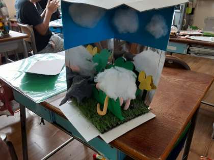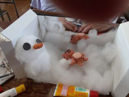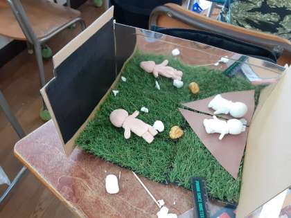 5年生は、図画工作科で、「夕日」を描き終わった児童から、「ミラクル!ミラーステージ」の続きを作っているようでした。壁面のミラーのお蔭で広がる世界で、自分が観たいことややってみたいことを表現しているようでした。