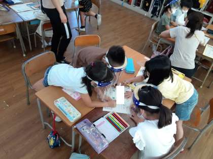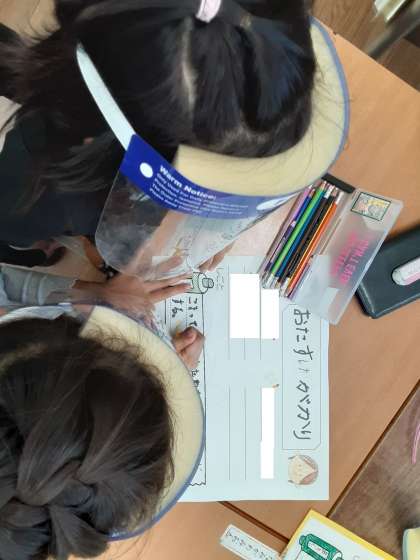 1年生では、係活動の掲示物を作っていました。各係に分かれて活動内容について話し合いました。そして、色画用紙に係メンバーの名前や活動内容を書いていました。
