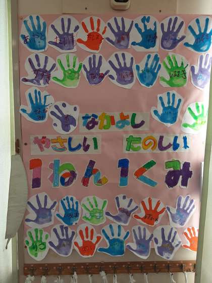 教室の壁面には、みんなの手形に囲まれた「なかよし たのしい やさしい 1ねん1くみ」の掲示が貼ってあります。みんなが過ごしやすくなるために係活動もがんばって、よい学級にしていってほしいです。