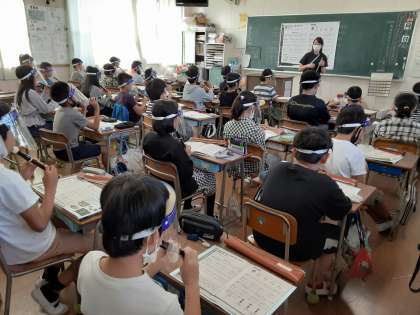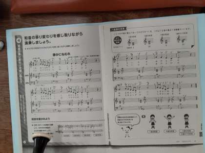 5年生では音楽科で「静かにねむれ」を練習していました。1小節目から2小節目に移るのに、低い「ド」から高い「ド」へ1オクターブ動きます。また、「ミ レ ド」と低い音で動くところも、指使いだけでなく息使いも難しいようです。何度も繰り返し練習していました。美しい音が出せるようにがんばってほしいです。