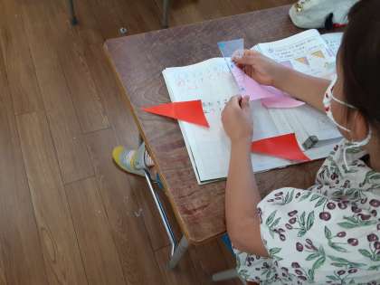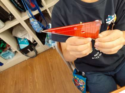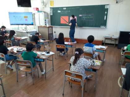 2年生では、算数科で「三角形と四角形」を学習しています。本時では、正方形や長方形を2つに切ってできる形を調べました。三角定規を使って調べました。できる形は、三角形でした。そして、その三角形には直角になる角がありました。「三角形」「四角形」「辺」「頂点」「直角」など、算数科でいくつか新しい言葉が出てきています。それでも、子どもたちは戸惑わず慣れてきているようです。