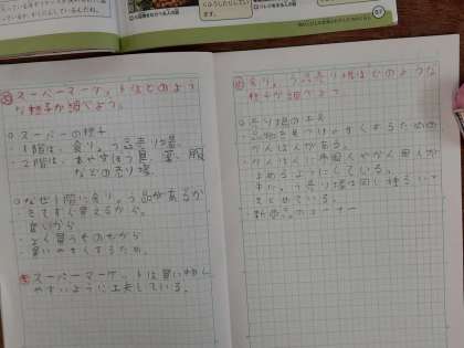 3年生では社会科でスーパーマーケットについて学習しています。1組では、前時にスーパーマーケットの各階でどんな売り場があるのか調べました。本時では、1階食料品売り場の様子について詳しく調べ、お店の工夫について考えました。子どもたちは、おうちの方の買い物についていったときに様子をよく見ているのでしょうか。お店の様子について、意外によく知っていました。