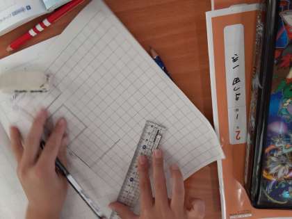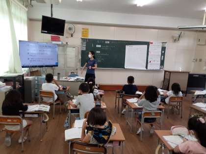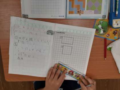 2年生では算数科で「三角形 四角形」を学習しています。1組では、これまでに習った形「長方形」「正方形」「直角三角形」を作図しました。直角三角形を描くのに「直角の両側の辺の長さが3cmと4cm」の言葉に戸惑っていた児童がいました。ノートのマスの角が直角であることに気づきにくいようでした。